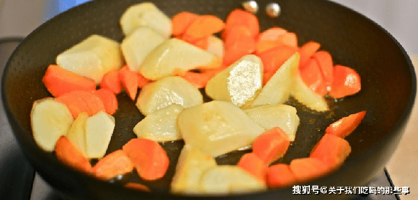 2、土豆、胡萝卜去皮,洗干净后切块。锅里倒油烧热,放入土豆、胡萝卜,小火煎至表面焦黄,加入少量老抽翻炒上色,盛出备用。
