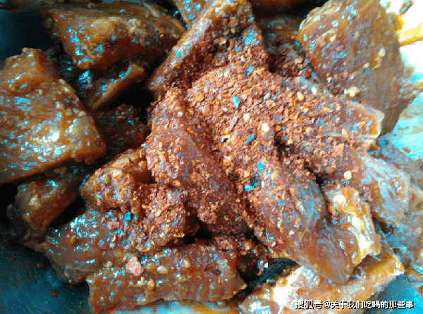 2、排骨块放入葱姜、生抽、老抽、白糖、十三香、米酒、白胡椒粉、食盐,倒入炒好的红油豆瓣,抓拌均匀后腌制2小时入味,最后放入辣椒面、香油搅拌均匀。