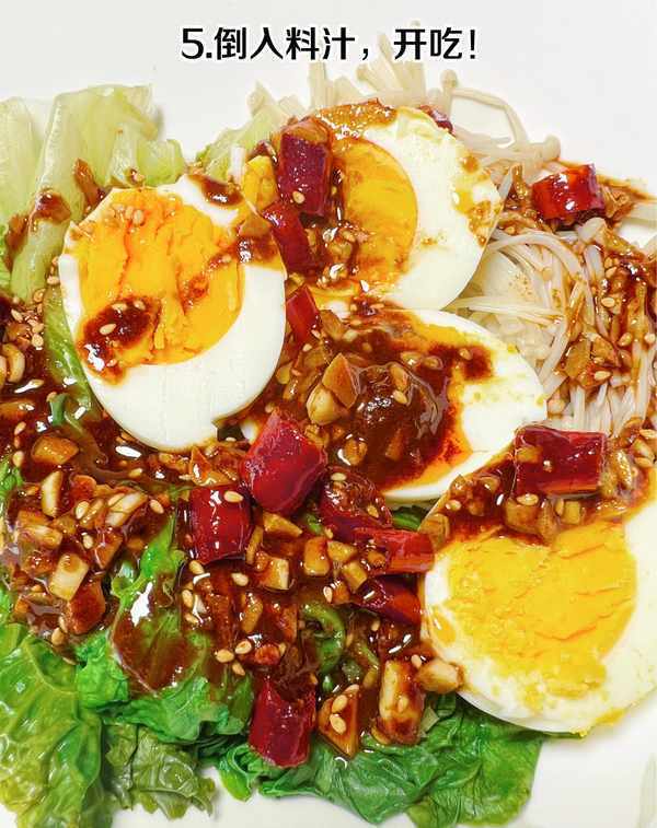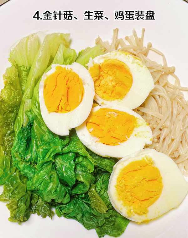 4.将金针菇、生菜和鸡蛋放入碗中。