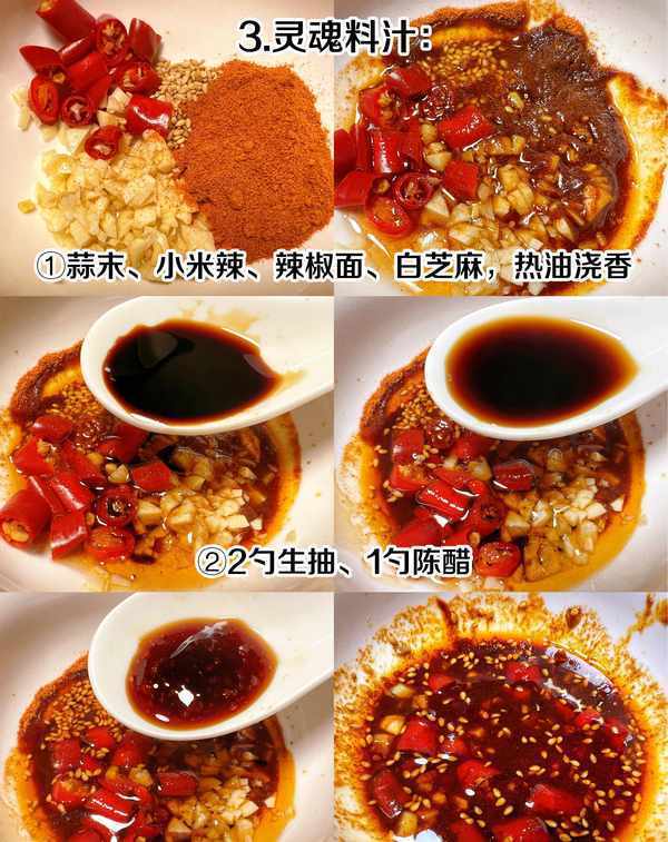 3、灵魂酱:蒜茸、辣小米、辣椒酱、白芝麻、热香油、生抽2勺、陈醋1勺、蚝油1勺,拌匀。
