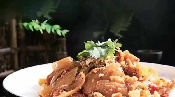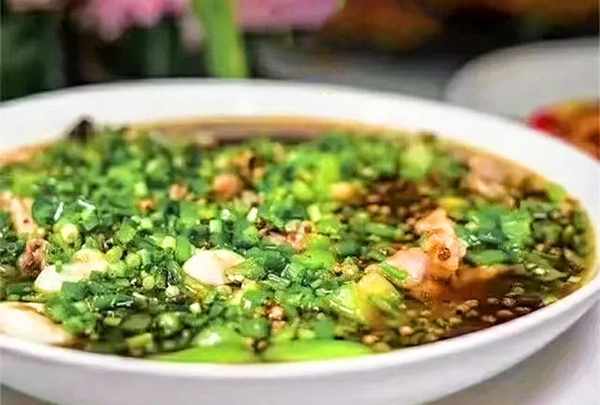 上桌时,先将青蒜尖倒入用上述香料调制的酱汁中,再淋上辣油。