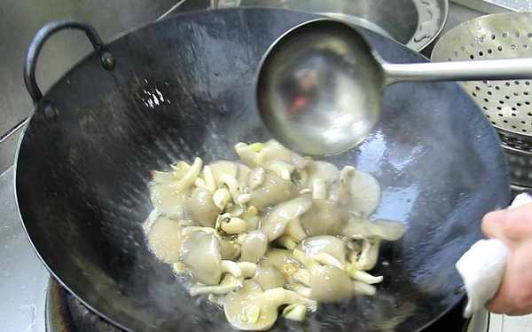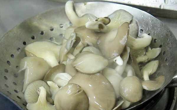 2、锅中烧开水,加少许盐和鸡粉调味,加少许植物油防止平菇中的营养成分流失,水开后将平菇放入锅中,焯水。大约1分钟,当蘑菇变软时,将它们倒出并迅速过冷水以检查水分以备后用。生蚝最好先焯一下再吃,不然吃起来有点涩。
