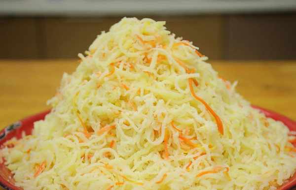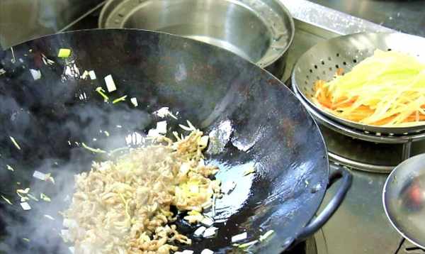 趁热在锅中加热油。加入葱、姜和蒜炒香,然后加入切好的猪肉翻炒几下,然后加入切碎的生菜。加入3克白醋,大火翻炒30秒,加入2克盐,1克鸡精,翻炒使调味料溶解,加少许提鲜生抽,倒入少许油把它点亮,然后就可以放在盘子里端上来了。