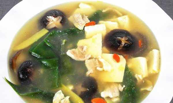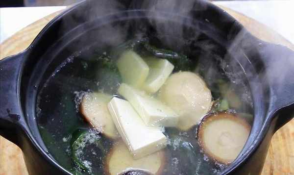3、锅中再次烧开水,放入姜片,加入2克盐和1克胡椒粉提味。大火烧开水,倒入香菇、海带和豆腐碎,用勺子拍去浮沫。