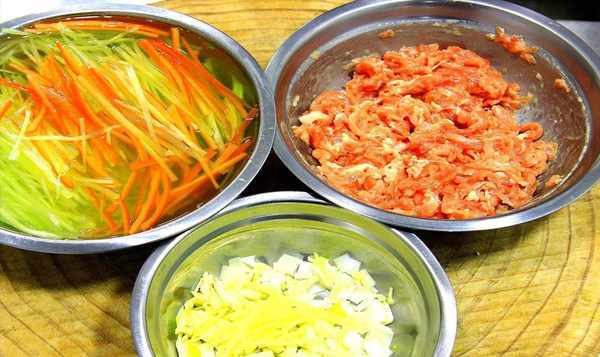 3.在锅中加热油,直到油温达到40%。倒入剁碎的猪肉,如果有粘性,用勺子把肉末掰开,滑动至猪肉变色,捞出过油待用。