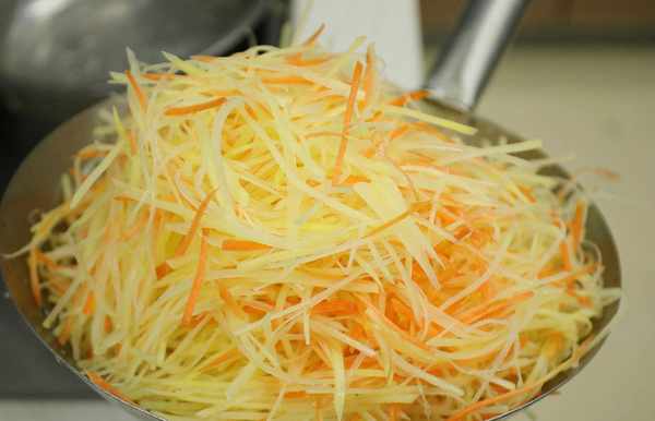 1.土豆去皮洗净,然后切成片。浸泡在清水中,然后切一些胡萝卜以搭配颜色。然后取出,沥干水分,准备蒸菜,蒸菜一定要尽量干,不要放水,不然蒸完容易掉肉。