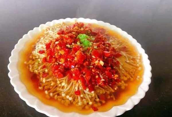 4、在金针菇上均匀撒上2汤匙蒸鱼酱油,烧热2汤匙花生油,淋上葱花,将热油浇在金针菇上即可!
