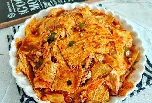 材料:豆皮、蒜、姜、红辣椒、小葱、老抽、豆瓣酱、盐、料酒、生抽、花椒粉