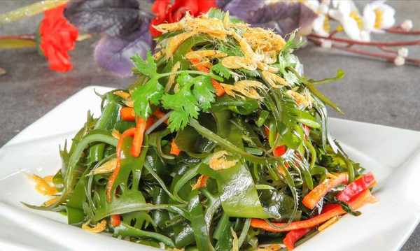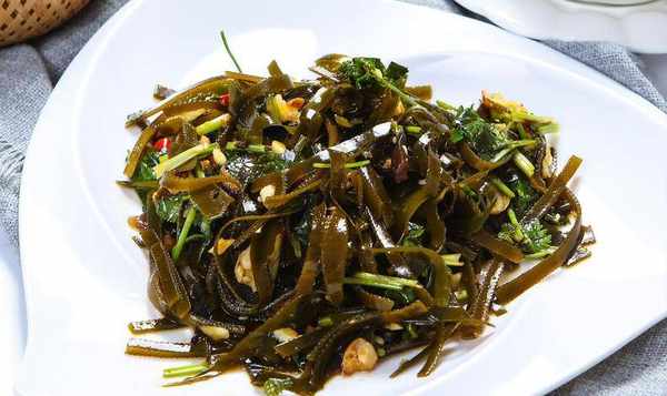 将切碎的海带洗净,放入沸水锅中,煮30秒,捞出控一下,但不要放在冷水中,否则会非常难嚼。将切碎的紫菜放入碗中,加入蒜末、葱花和辣小米。植物油烧热后浇在上面。最后加入香油、生抽和陈醋,拌匀即可食用。