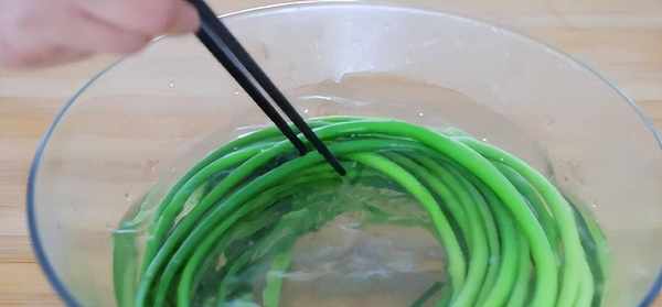 1、准备一把蒜苔,将蒜苔去根,加一茶匙盐,放入沸水中,焯水一分钟,捞出晾凉,将水倒掉。