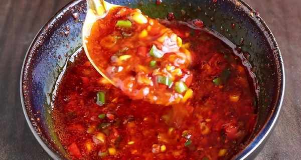4.做酱料,切碎一些葱花,放入碗中,加入一勺蒜末,两勺辣椒面,倒入一勺意大利辣香肠油,加一勺盐调味,一小勺鸡精、少许生抽和米醋,用勺子拌匀备用。
