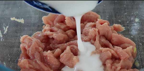 2、加入少许水、淀粉和蛋清,然后用手搅拌均匀。搅拌一分钟后,倒入少量油以保留水分。