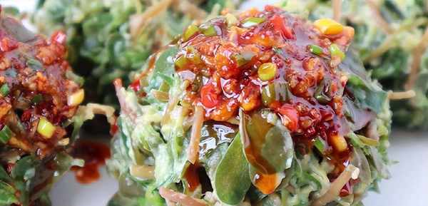 5、时间到了,马齿苋饺子就蒸好了,色泽鲜绿,味道香香,淋上酱汁,味道太香了。