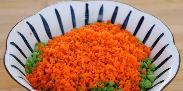 2、蒜苔切碎放入锅中,胡萝卜切半根,放入蒜蓉台,五花肉切小方块,放入碗中,打三个鸡蛋在碗中拌匀待用使用。