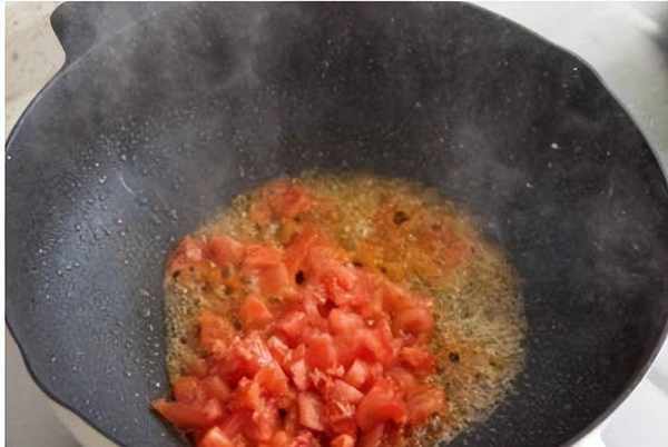 5、另一锅倒入适量食用油烧热至70%热,然后放入西红柿炒至出汁。6、加适量水,放入玉米粒,水烧开,用勺子舀出1勺虾茸,小心放入锅中,翻动几下。加盐,加水淀粉勾芡拌匀。