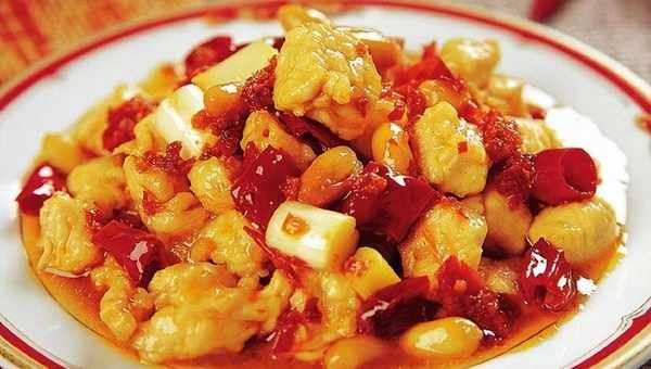 3 热油锅,将干辣椒炒至棕红色,加入花椒粒,再放入鸡丁炒。同时下葱、姜片、蒜片炒,加辣酱油炒,花生米下锅翻炒即可。