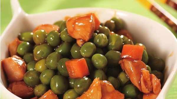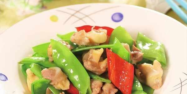 3 锅内放油烧热,将干辣椒炒香,加入荷兰豆和鸡腿,加盐和味精搅拌均匀,用水淀粉勾芡,淋上香油。