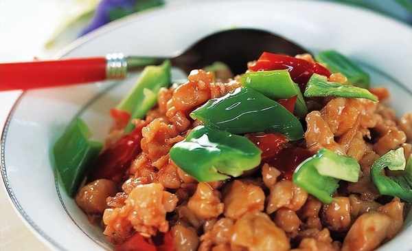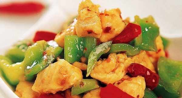 原料 1只清淡的鸡肉(约1000克)、50克干辣椒、100克青椒片