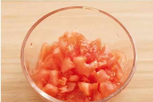 4、西红柿取出稍凉,剥去皮,去蒂,切成小块。