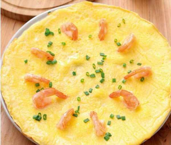 5、待蛋液未完全凝固时,加入炸好的大虾,撒上葱花至蛋液完全凝固即可出锅。