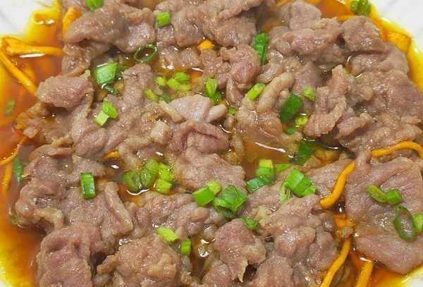 2、虫草花洗净沥干水分,铺在盘底,再铺上腌制好的牛肉水烧开蒸十分钟左右。