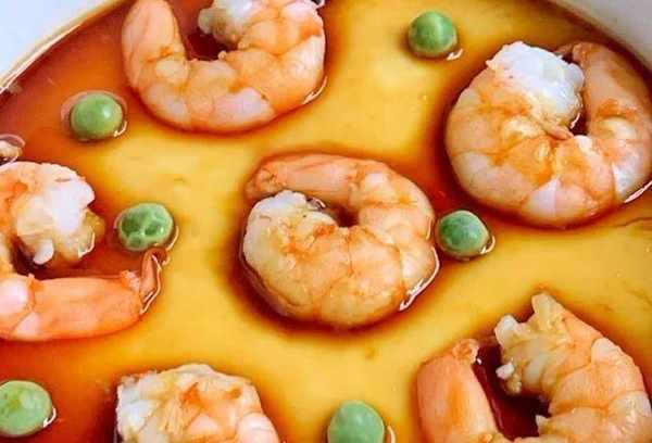 5.鸡蛋蒸好后,开盖,加入虾仁和青豆盖上锅盖继续蒸3分钟。蒸好后取出,淋上蒸鱼酱油即可食用。