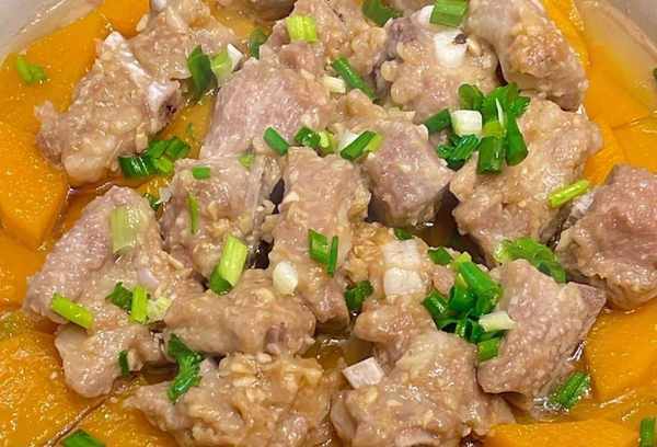 3、将西葫芦洗净,洗净切成薄片,均匀地放在盘子底部,然后将腌制好的排骨放在西葫芦上。4、取一锅开水,水开后放入南瓜排骨,中火蒸半小时。蒸好后取出,撒上葱花,淋上热油提香,即可食用。