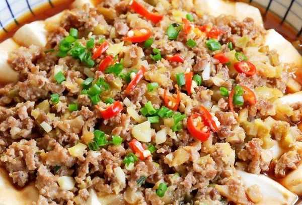 准备食材:猪肉、榨菜、水豆腐、姜末、洋葱、蒜末、辣小米。