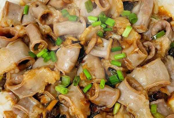2、香肠粉洗净,加入面粉和盐洗净,然后洗净,切成小块。锅中烧开水,将热酒和粉条放入水中煮约十五秒,捞出沥干水分,倒入少许水淀粉和豆豉,摇匀备用.