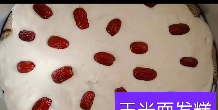 3:取一个平底锅,刷底油,倒入面团摊平,撒上红枣,盖上盖子发酵至两倍大。