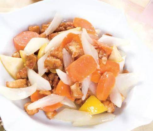 4胡萝卜去皮洗净切块;将洋葱洗净,切成片。