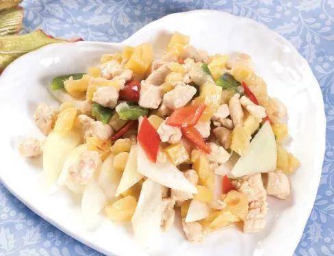 鸡肉250克、菠萝100克、洋葱50克、青红椒各25克