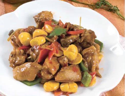 4加入鸡块,煮料酒,加入精盐、糖、酱油、鲜汤烧开,再加入栗子、青椒、红椒煮至熟,勾芡淋入香油。