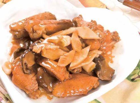 4加入冬笋片和香菇片,盖上锅盖,小火煮至鸡翅熟透入味。