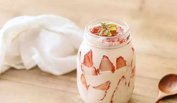 4.将步骤3的玻璃罐放入冰箱冷藏3-5小时至凝固,淋上草莓泥即可。