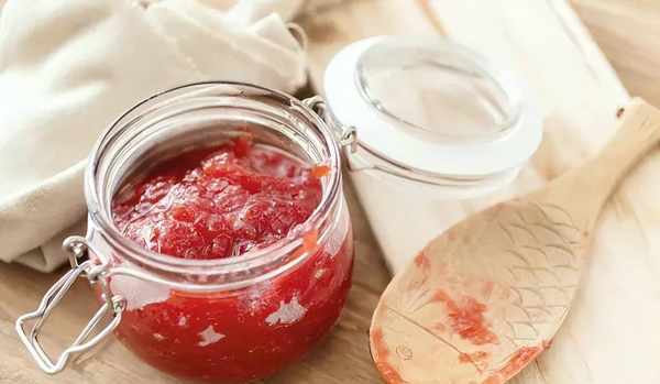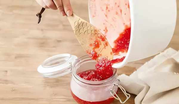 趁热,将其放入玻璃瓶中,然后将其倒置,这样空气就不会进入瓶子,细菌也无法进入。制成的果酱应存放在冰箱中。开封前保质期3个月,开封后1个月。