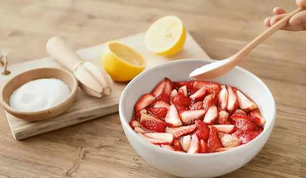 3.加入糖和柠檬汁拌匀。