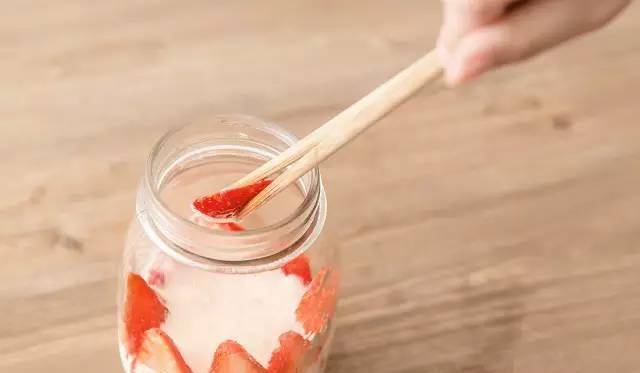 3.将步骤2中完成的面糊的三分之一倒入玻璃瓶中。将草莓切半,放在罐子边上。重复上述操作,直到罐子装满为止。