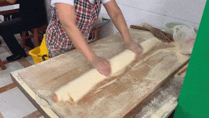方叶法(方形饺子皮)就是像手工面条一样,在大桌子上用大擀面杖擀出一个厚度一样的大面团。然后把擀好的面团倒过来折叠(容易展开),把长面团切成三四指宽。然后将切好的面团摊开,压扁,合在一起。一刃前宽后窄,前窄后宽。剪下一组一端宽一端窄的梯形方叶。).