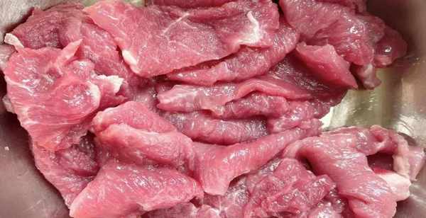 选择猪的通脊肉,去掉筋膜之后,切成大概0.5厘米厚度的片,为了让肉的口感更好,可进行拍打;切好后的肉片,再加一些盐,料酒,用手给它抓匀。