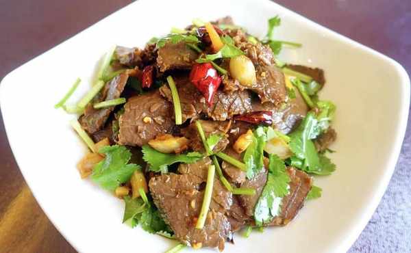 大葱小葱全部切丝,再拍一点大蒜,味道瞬间上头。锅烧热油,泼到刚刚备好的大料里,最后浇在牛肉上,用手抓拌均匀即可。