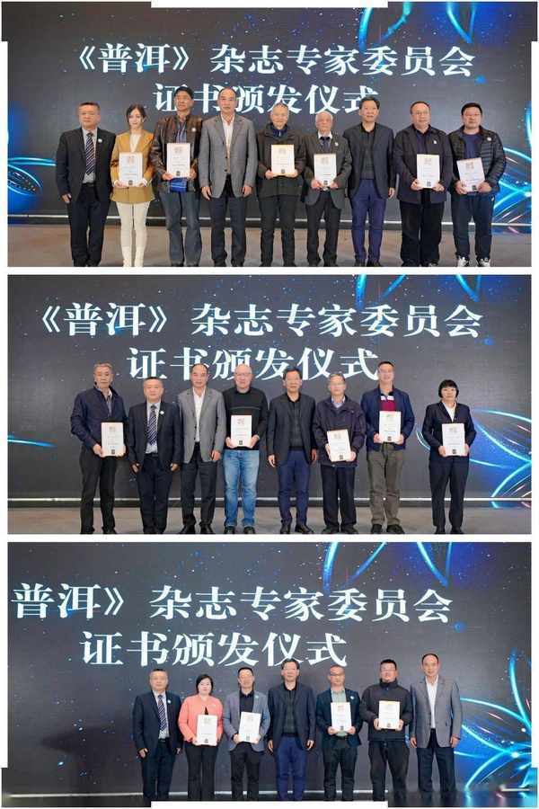 对话环节结束后,第四届景迈山论坛也进入活动的尾声。由云南省人民政府参事、原云南省农业厅厅长、《普洱》杂志顾问王敏正、云南省普洱茶协会会长《普洱》杂志顾问董胜和《普洱》杂志社社长罗洪波,共同为到场的部分《普洱》杂志专家委员会成员颁发证书,感谢这些年来,他们和我们一起,始终与产业并肩同行。