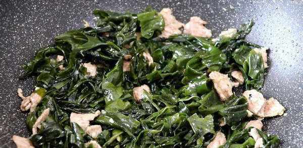 5.然后将切好的裙带菜加入牛肉中搅拌几秒钟;