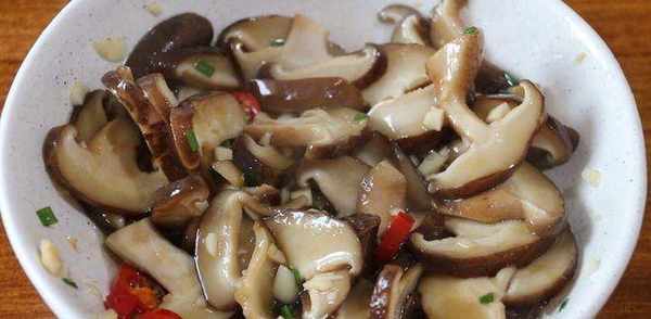 4。将香菇放入碗中,加入蒜末、红辣椒圈和葱花,油烧热后浇在配料上;