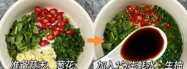 1、接下来,准备一碗酱料,准备一碗蒜末、小米椒、香菜和葱花,然后淋上热油提香。然后加入蚝油和酱油。调味并搅拌均匀。