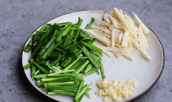 准备食材:韭菜300克,春笋150克,蒜米适量。