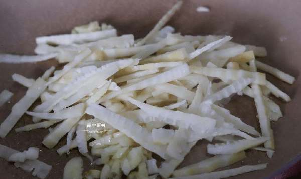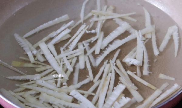 4、 把锅洗净,然后下入多一些的食用油,将油温烧热之后,再将蒜末放入锅中爆炒,出香味,就可以加入沥干水分的春笋,一起快速翻炒,把春笋炒干了。