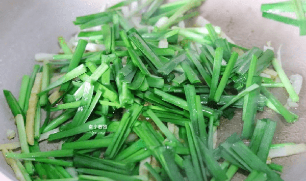 5、 锅中飘出香气之后,就可以加入韭菜一起翻炒到韭菜变软。