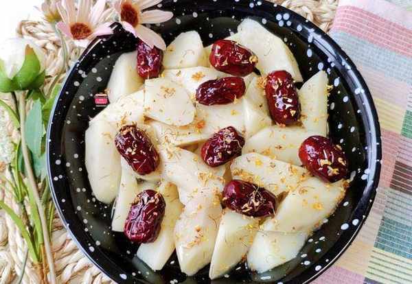 4、将调好的桂花糖淋在蒸好的山药上,拌匀后即可食用。