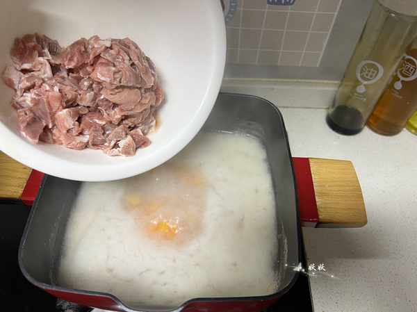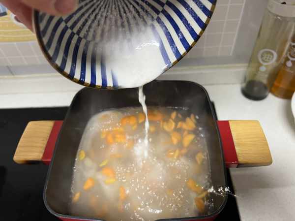 3,红薯粉或者生粉一碗,加入清水勾成浓欠汁,加入煮好的汤水里,用汤勺搅拌开,汤汁会逐渐变得浓稠,呈糊状。